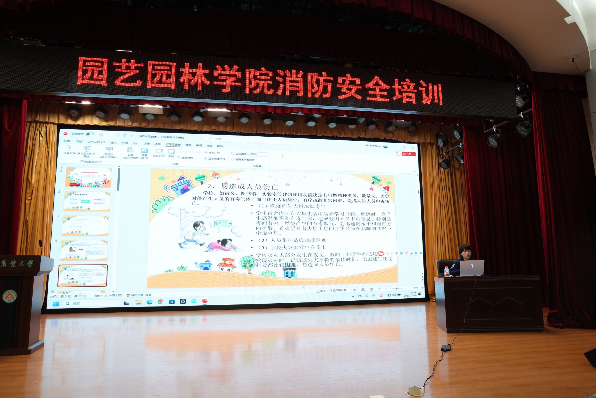 为深化平安校园建设,强化学生安全防范意识,提高应急处理能力,10月24日下午,园艺园林学院、保卫处、实验室管理处联合举办了2023级新生安全教育系列活动,香坊区消防救援大队副队长毕晟,保卫处副处长陈亮、实验室管理处副处长张艳国、园艺园林学院副院长马鸿艳及全体辅导员出席活动,2023级全体研究生和本科生参加活动。